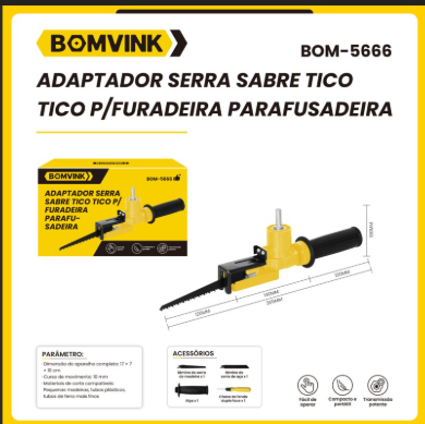 Transforme sua furadeira ou parafusadeira em uma versátil serra tico-tico com o Adaptador Serra Sabre Bomvink. Ideal para cortes precisos em madeira, plástico e tubos de ferro fino, este adaptador oferece praticidade e economia, eliminando a necessidade de ferramentas adicionais. Seu design compacto e leve facilita o manuseio, proporcionando cortes rápidos e seguros. Com acabamento em aço resistente e alça ergonômica, garante conforto durante o uso. Acompanha lâmina de serra para madeira, lâmina de aço, alça auxiliar e chave de fenda dupla face para uma instalação fácil e rápida.